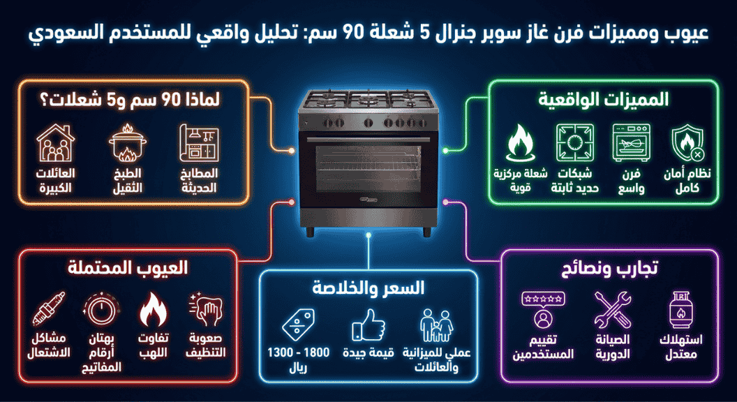 وصلنا إلى الجزء الأهم في هذا التقرير التحليلي. هنا سنفصل عيوب فرن غازهام ومميزاته 5 شعلة 90 سم في السعودية بوضوح تام.